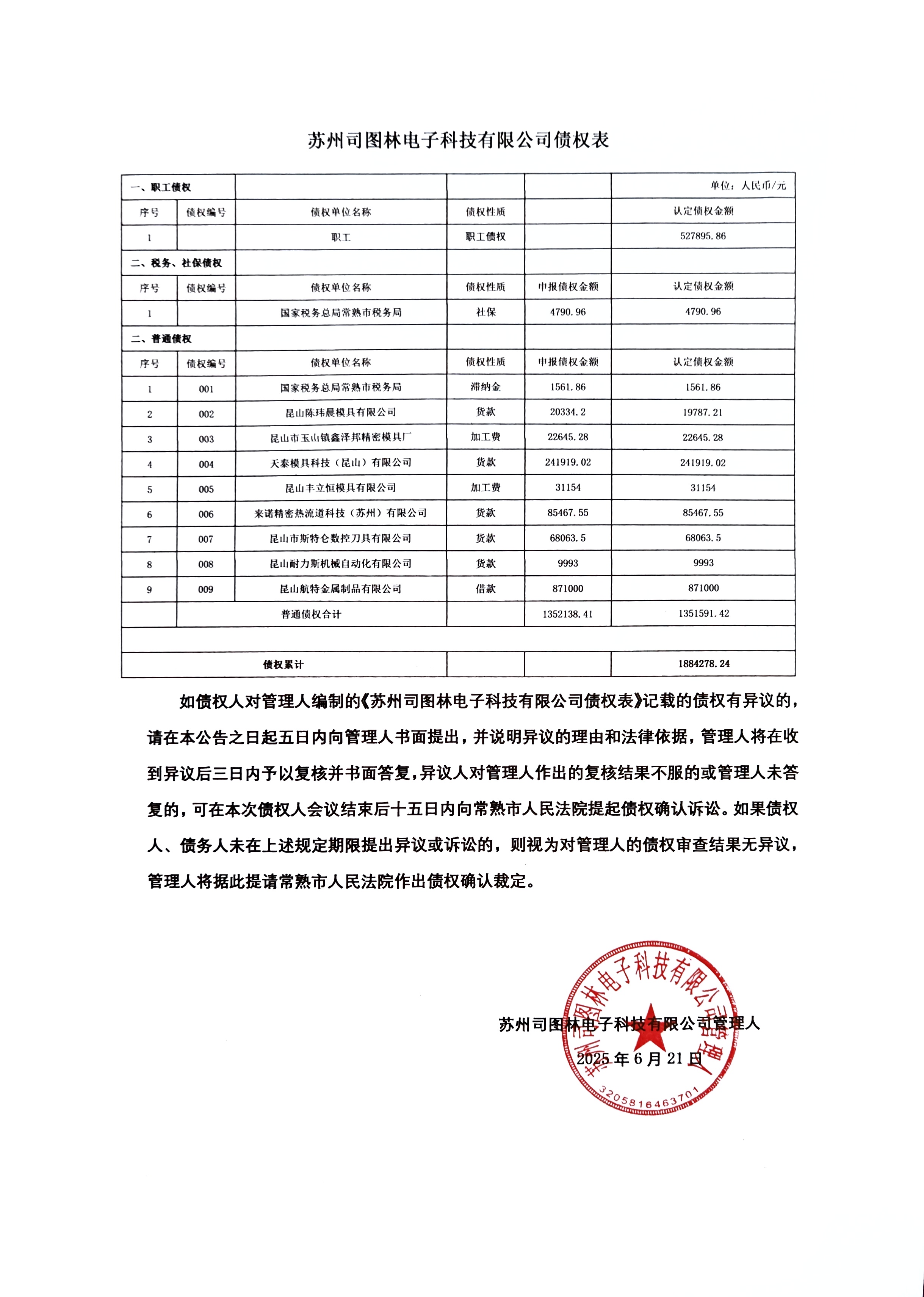 9、苏州司图林电子科技有限公司职工债权公示、职工债权表